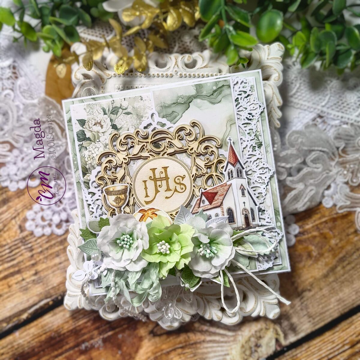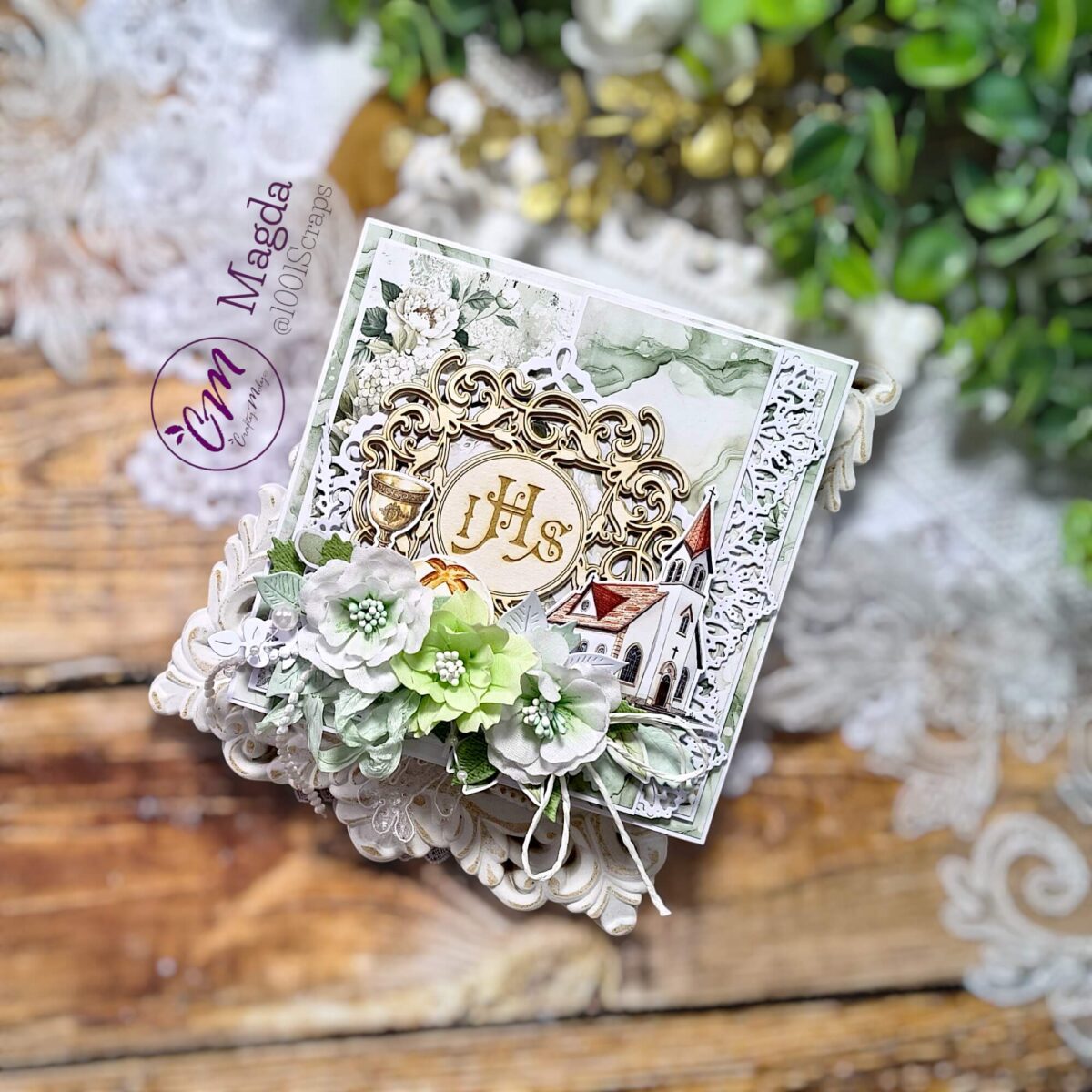 Kartka komunijna z kwiatami to elegancki, ręcznie wykonany projekt utrzymany w delikatnym odcieniu zieleni. Całość została stworzona w technice scrapbooking, z dbałością o każdy detal, subtelne warstwy oraz harmonijną kompozycję. To realizacja, która łączy precyzję rękodzieła, estetykę papieru i kreatywny wyraz artystyczny.
