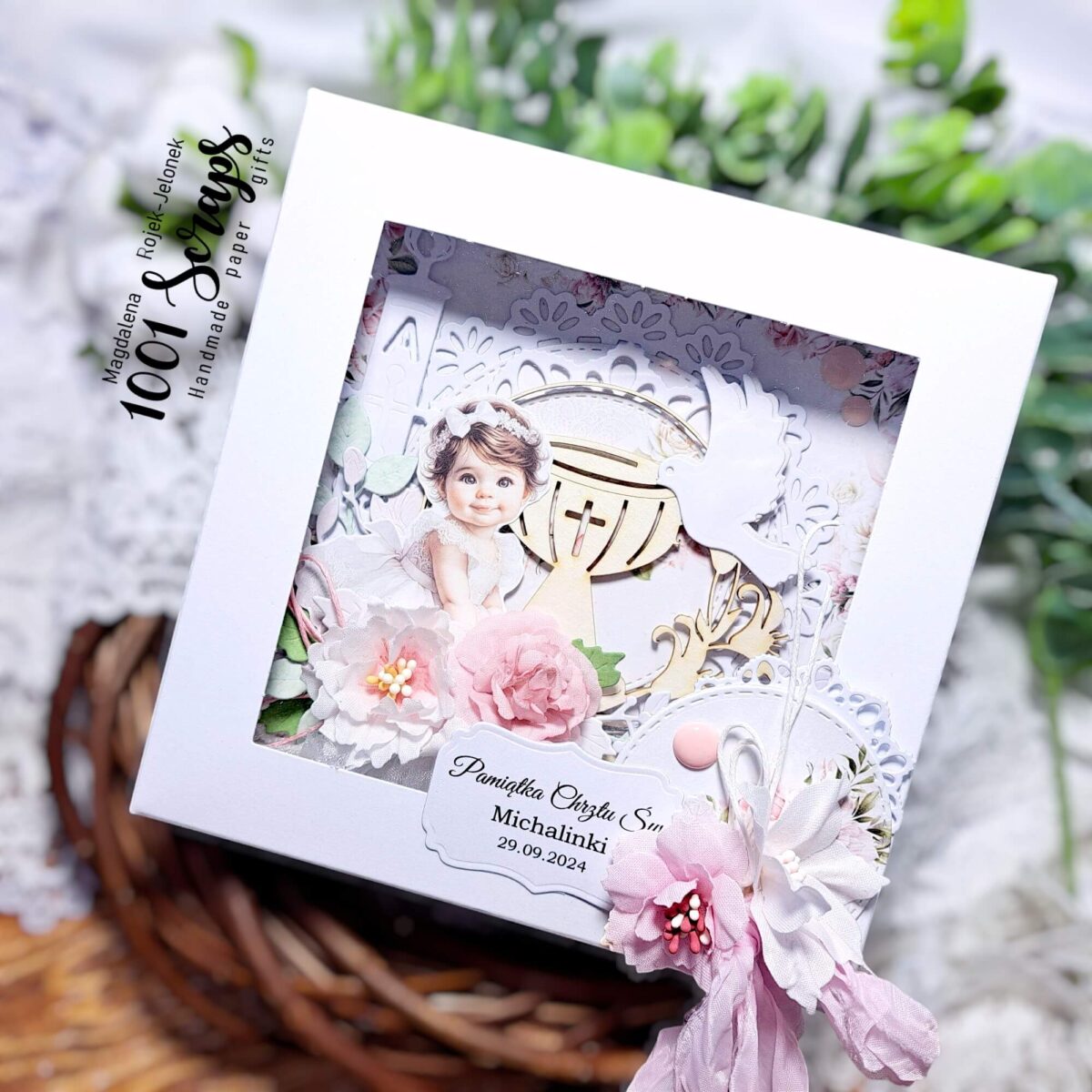 Projekt łączy w sobie delikatność, symbolikę i artystyczny charakter, dzięki czemu doskonale sprawdzi się jako wyjątkowy dodatek do prezentu na chrzest małej dziewczynki.