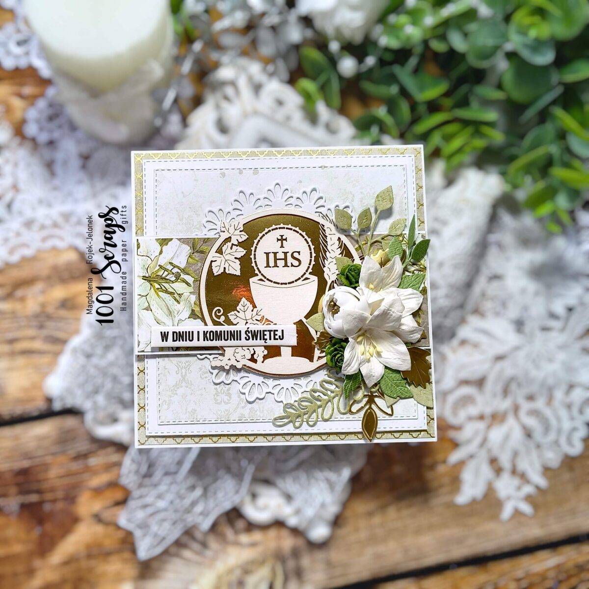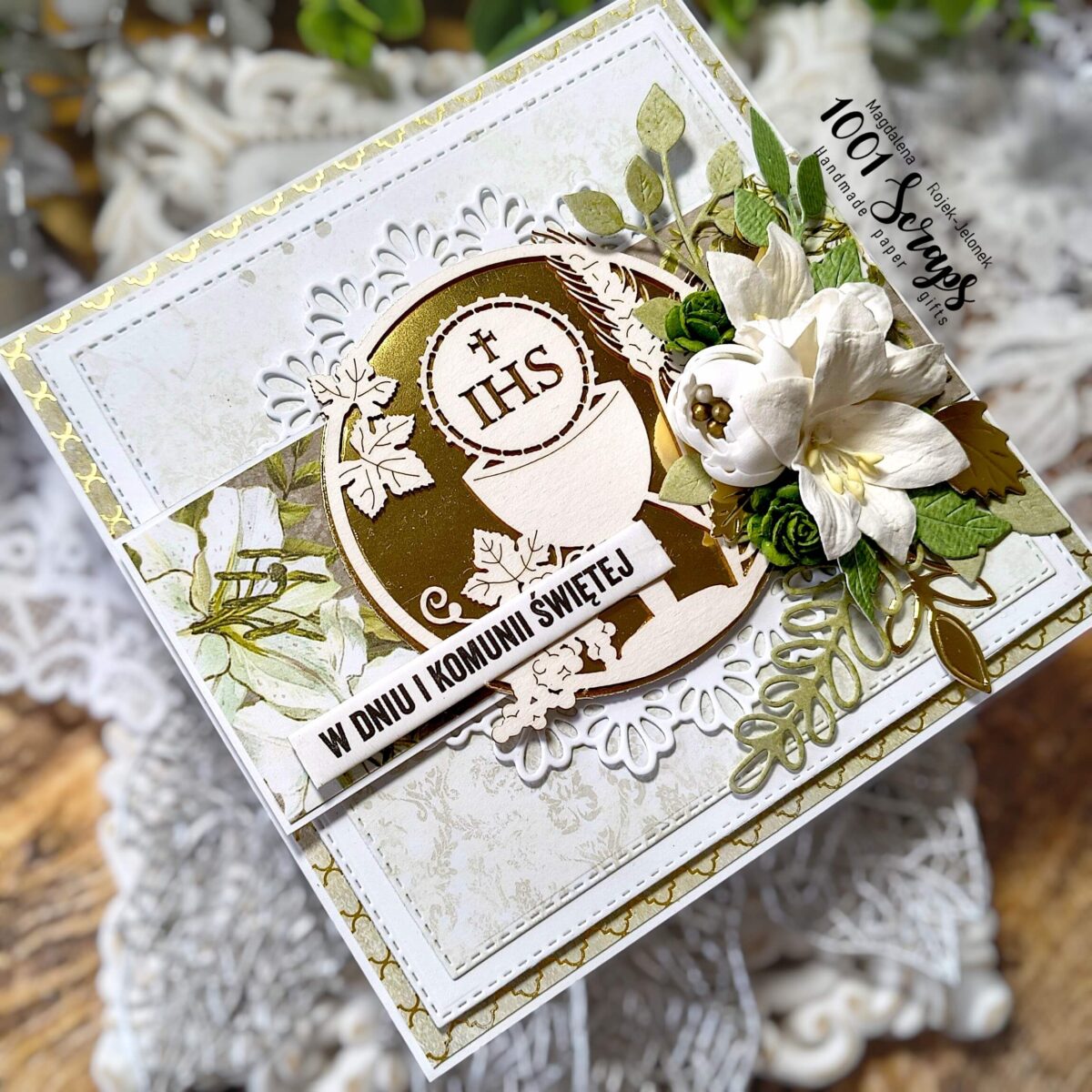Kartka komunijna „Golden Lily” to harmonijne połączenie klasycznej elegancji i rękodzielniczego kunsztu. Delikatna kolorystyka beżu, bieli i zieleni, uzupełniona złotymi akcentami, sprawia, że kartka doskonale wpisuje się w charakter uroczystości Pierwszej Komunii Świętej – zarówno dla dziewczynki, jak i chłopca.