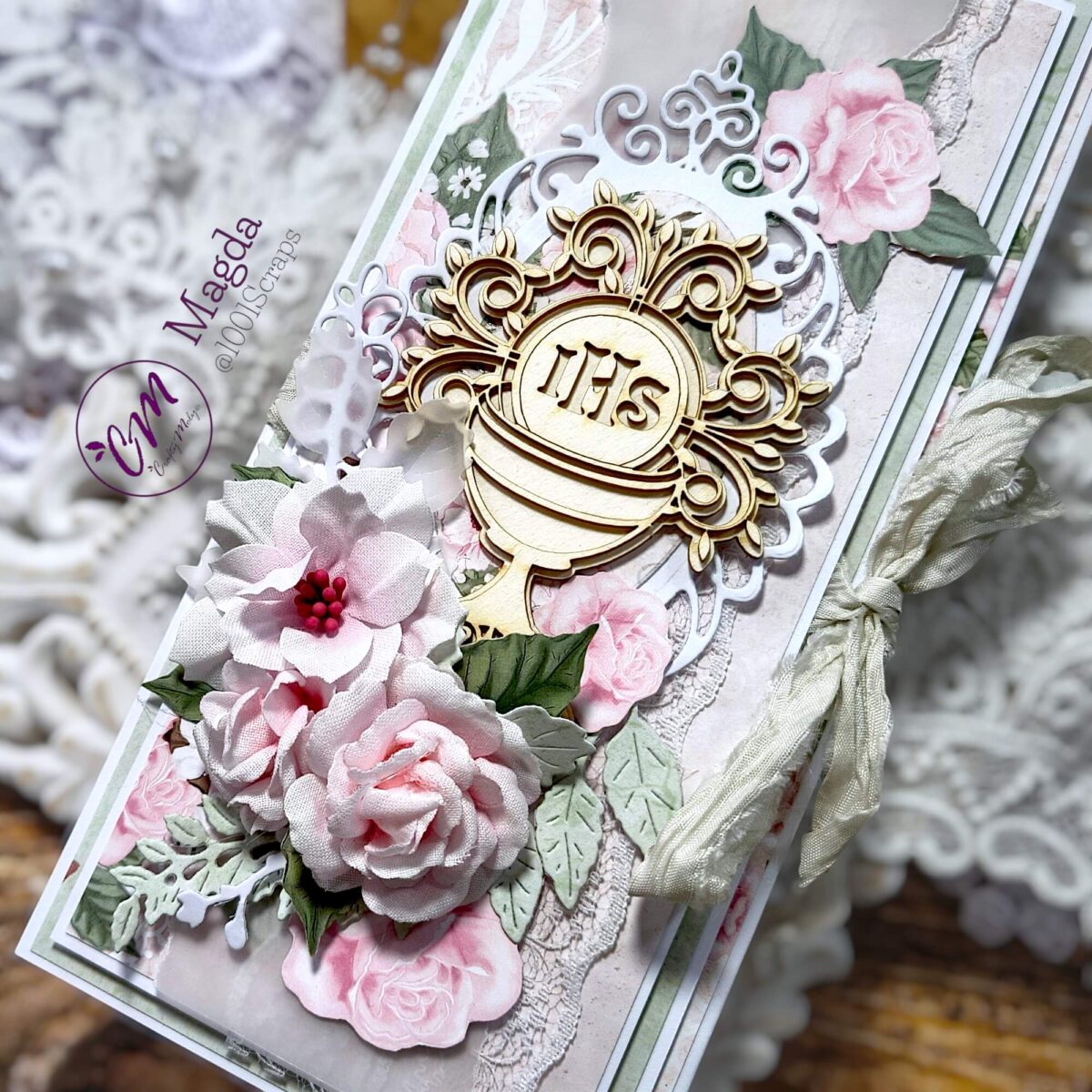 Elegancka kartka komunijna handmade w formie zamykanej koperty, wykonana metodą scrapbookingu. Subtelna, romantyczna kompozycja z kielichem i ręcznie tworzonymi kwiatami z bawełny czyni ją wyjątkową pamiątką Pierwszej Komunii Świętej.
